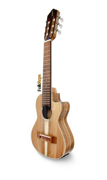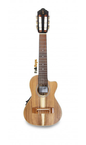 A guitalele (sometimes spelled guitarlele or guilele) is a guitar-ukulele hybrid,that is, “a 1/4 size” guitar, a cross between a classical guitar and a tenor ukulele.The guitalele combines the portability of a ukulele, due to its small size, with the six single strings and resultant chord possibilities of a classical guitar. It may include a built-in microphone that permits playing the guitalele either as an acoustic guitar or connected to an amplifier. The guitalele is variously marketed (and used) as a travel guitar or children’s guitar. A guitalele is the size of a ukulele, and is played like a bass pitched up to “A” (that is, up a 4th, or like a guitar with a capo on the fifth fret). This gives it tuning of ADGCEA, with the top four strings tuned like a low G ukulele. From Wikipedia, the free encyclopedia
